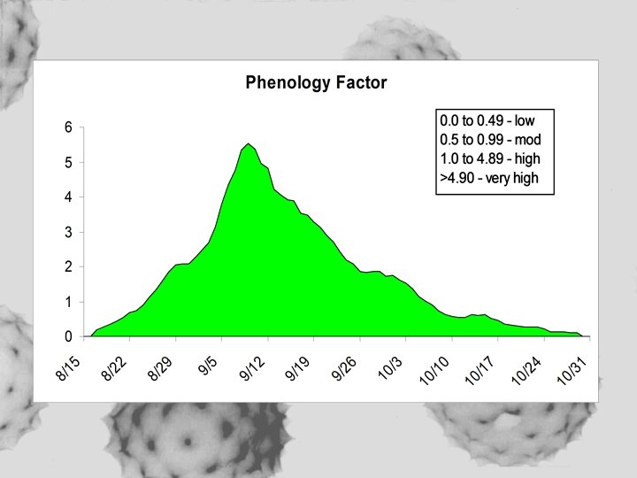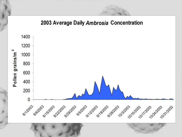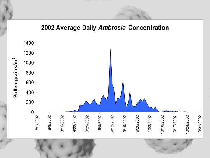 Pollen Season Characteristics • Mean start date (5% of season total) – 27 Aug • Mean end date (95% of season total) – 11 Oct • Mean peak date – 10 Sep