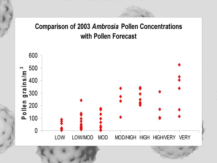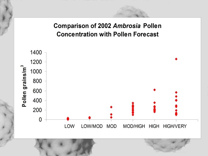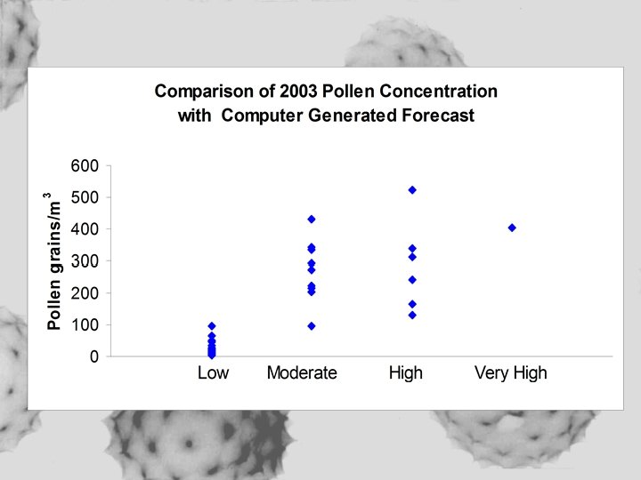 Conclusions • Empirical model accurately predicted the pollen level on 84% of the days during the 2002 and 2003 ragweed seasons (74% using NAB levels) • Computer program needs more work • Pollen forecasts are only as accurate as the meteorological forecasts • More research is needed on the – effects of RH and rain on pollen release and dispersal – influence of pre-season meteorological conditions on the seasonal pollen potential