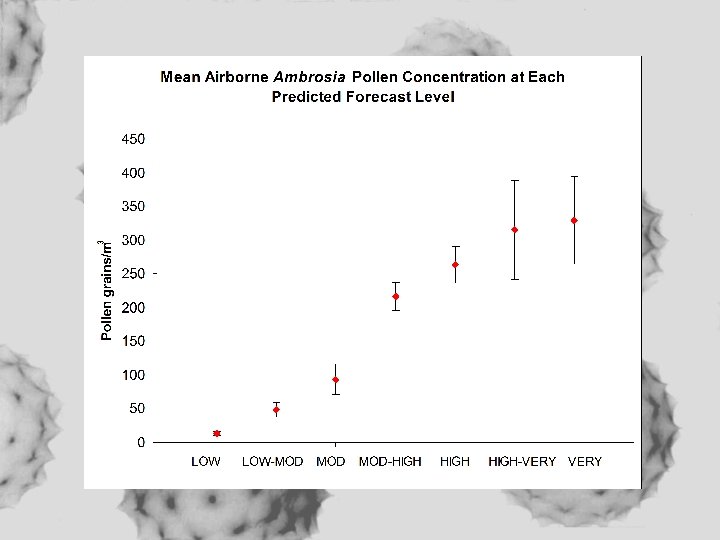 What are Low, Moderate, High, and Very High Values? NAB* 1994 AAAAI Pollen and Spore Report Tulsa Model Low Moderate High Very High 0 -50 th 50 -75 th 75 -99 th >99 th NAB Concen 0 -9 10 -49 50 -499 >500 Tulsa Concen 0 -129 129 -284 285 -613 >613 Percentile 0 -50 th 50 -75 th 75 -90 th >90 th Tulsa Concen 0 -129 129 -284 285 -410 >411 Percentile Goal 0 -25 th 25 -50 th 50 -95 th >95 th Actual Percentile 0 -27 th 27 -47 th 47 -95 th >95 th 0 -49 50 -99 100 -489 >490 Percentile Concentration *Burge, H. A. 1992. Monitoring for Airborne Allergens. Annals of Allergy, 69: 9 -18