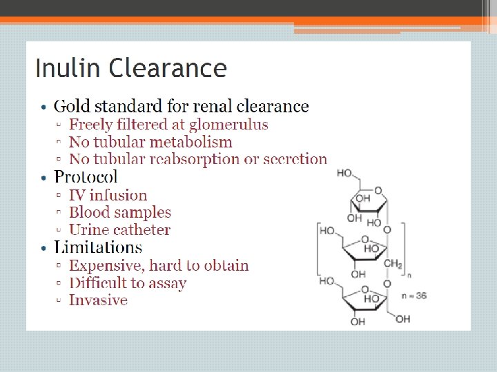 Calculated GFR • Standard 24 hours urine collection, using creatinine clearance; Cr. Cl ( GFR ml/min ) = (U cr. x V / P cr. ) / 1440 ▫ Cumbersome with regard of collection and urine sampling ▫ High probability of overestimation of GFR by 10 -20 % due to creatinine tubular secretion, particularly in advanced CKD ▫ Better estimation of true GFR, especially in early nephropathy or CKD patients