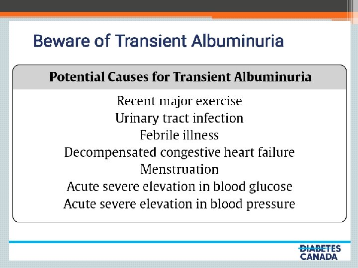 Albumin: creatinine ratio ( ACR ) • Morning spot urine sample • Urine mg albumin/ g creatinine • Standard evaluation of early diabetic nephropathy ▫ Men < 17 , women < 25 microalbumiuria macroalbumiuria