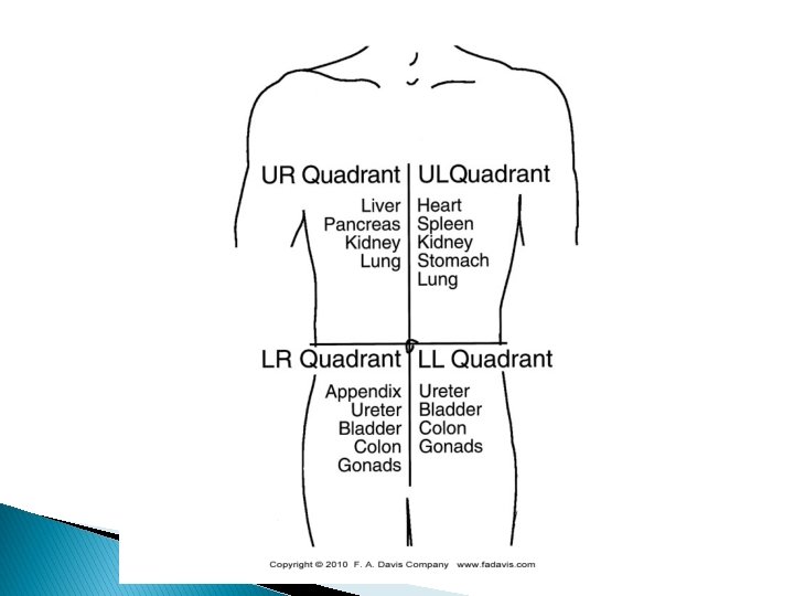 Palpation of Abdomen � Hook lying position ◦ Rigidity �Secondary to muscle guarding or blood accumulating in abdomen; internal injury likely ◦ Rebound tenderness �Pain increases after you remove your hands from the organ (common in appendcitis) ◦ Tissue density �Tapping or percussing over organs (hollow vs. nonhollow organs)