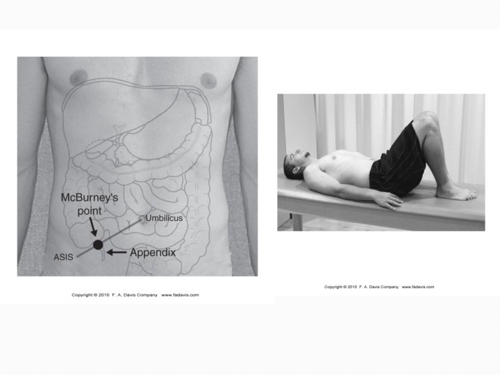 Appendicitis � MOI ◦ Rapid, not usually blunt trauma � S&S ◦ Initially diffuse P! in abdomen, slowly moves to lower right quadrant, nausea, vomiting, constipation, low grade fever �Right leg bent up vs. down on table ◦ Usually males between 15 -25 ◦ P! over Mc. Burney’s point � Tx ◦ Immediate referral to ED ◦ Surgical removal- usually laproscopy