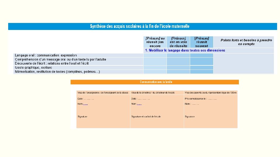 ü un document national OBLIGATOIRE ü établi à l’issue de la dernière année du cycle 1 ü qui ne donne pas lieu à la passation de préalable d’une série d’épreuves spécifiques d’évaluation ü qui est renseigné par les enseignants de cycle 1 réunis en conseil de cycle à partir du carnet de suivi des apprentissages ü qui reflète ce que l’enfant SAIT ou presque faire à l’issue de sa scolarité en maternelle ü qui permet de faire le points sur les besoins à prendre en compte ü qui est transmis : - à la famille - aux enseignants de cycle 2