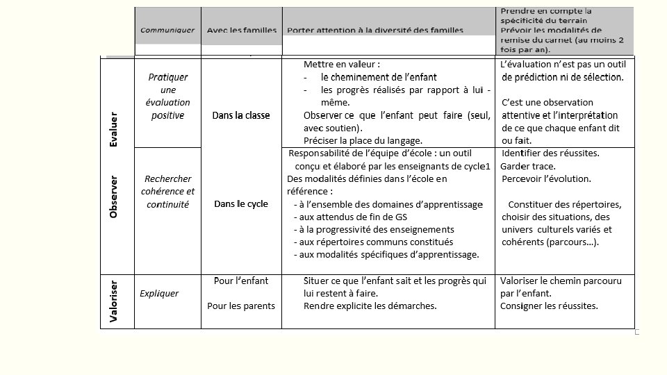 Principes au regard du programme Apprendre ensemble et vivre ensemble. Comprendre la fonction de l’école L’enseignant rend lisibles exigences de la situation scolaire par des mises en situations et des explications qui permettent aux enfants – et à leurs parents - de les identifier et de se les approprier. L’enseignant exerce les enfants à l’identification des différentes étapes de l’apprentissage en utilisant des termes adaptés à leur âge. Il les aide à se représenter ce qu’ils vont devoir faire, avec quels outils et selon quels procédés. Il définit des critères de réussite pour que chacun puisse situer le chemin qu’il a réalisé et perçoive les progrès qu’il doit encore effectuer = Fonder l’évaluation sur l’observation en situation = Donner au langage sa place dans le processus d’évaluation = Faire entrer l’enfant dans une dynamique de progrès des apprentissages