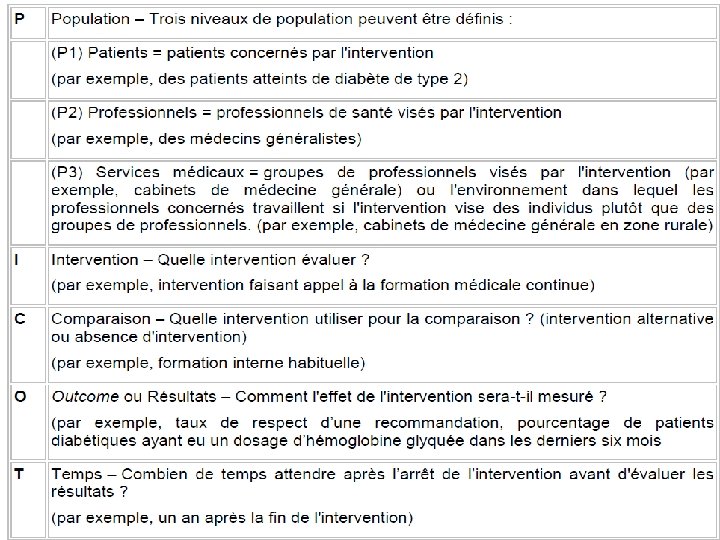 Avant la réalisation d’une étude d’intervention • S’assurer de l’intérêt et de l'implication des parties prenantes et identifier toutes les structures et ressources locales ou nationales en amont • Réfléchir aux questions éthiques, les exigences relatives au consentement éclairé et à la confidentialité variant selon le type d’étude, le type d’intervention et le type de données recueillies. • Préparer les étapes de son projet (Méthode PICOT Population – Intervention – Comparison – Outcomes – Time)