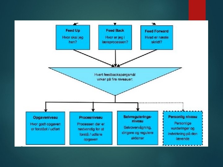 Prøv det selv – tal med din sidemand Kig på dagens læringsmål ( Feed-up) Hvordan vil I med egne ord formulere målene for i dag? Hvor er du nu ? ( Feedback) Hvad ved du , som du ikke vidste før? Hvor på LHR-taksonomi er du nu? Hvad skal der til for at du kommer endnu et skridt op af taksonomien? Hvad kan du selv gøre i undervisningen? Hvad kan du gøre efter denne undervisning?