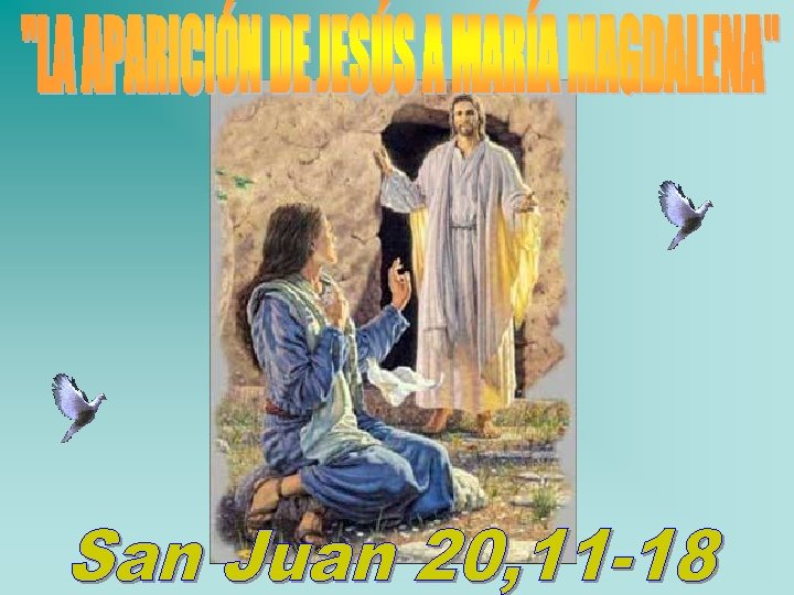 2°- LECTURA Lectura del Evangelio según San Juan Capítulo 20 Versículos : 11 - 18 La aparición de Jesús a María Magdalena 11. María se había quedado 13. Ellos le dijeron: «Mujer, ¿por qué afuera, llorando junto al lloras? » . María respondió: «Porque sepulcro. Mientras lloraba, se se han llevado a mi Señor y no sé asomó al sepulcro 12. y vio a dónde lo han puesto» . 14. Al decir dos ángeles vestidos de esto se dio vuelta y vio a Jesús, que blanco, sentados uno a la estaba allí, pero no lo reconoció cabecera y otro a los pies del lugar donde había sido puesto el cuerpo de Jesús.
