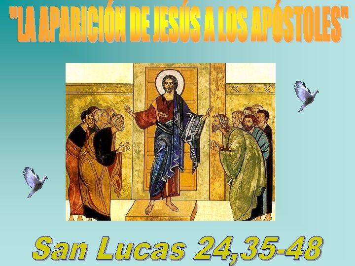2°- LECTURA Lectura del Evangelio según San Lucas Capítulo 24 Versículos : 35 - 48 35 Ellos, por su parte, contaron lo que les había pasado en el camino y cómo lo habían reconocido al partir el pan. 39 Miren mis manos y mis pies, soy yo mismo. Tóquenme y vean. Un espíritu no tiene carne ni huesos, como ven que yo tengo» . 40 Y La aparición de Jesús a los diciendo esto, les mostró sus Apóstoles manos y sus pies. 41 Era tal la 36 Todavía estaban hablando de alegría y la admiración de los esto, cuando Jesús se apareció en medio de ellos y les dijo: «La discípulos, que se resistían a creer. paz esté con ustedes» . 37 Pero Jesús les preguntó: «¿Tienen Atónitos y llenos de temor, aquí algo para comer? » . 42 Ellos le creían ver un espíritu, 38 pero presentaron un trozo de pescado Jesús les preguntó: «¿Por qué asado; 43 él lo tomó y lo comió están turbados y se les delante de todos. presentan esas dudas?