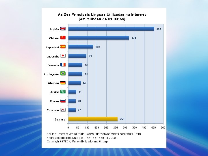 Usuários de Internet no Brasil (em milhões) 80 67, 5 70 60 50 42, 6 40 25, 9 30 32, 1 20 10 0 5 2000 2005 2006 Fonte: www. internetworldstats. com, acessado em 19/04/2009. 2007 2008