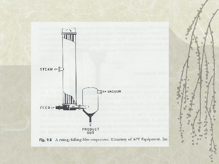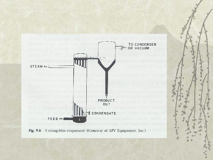 Types of Evaporator v 3. Rising-film evaporator – 10 – 15 m vertical tubes – Film of liquid move upward – Need 14 C difference between heating medium and product