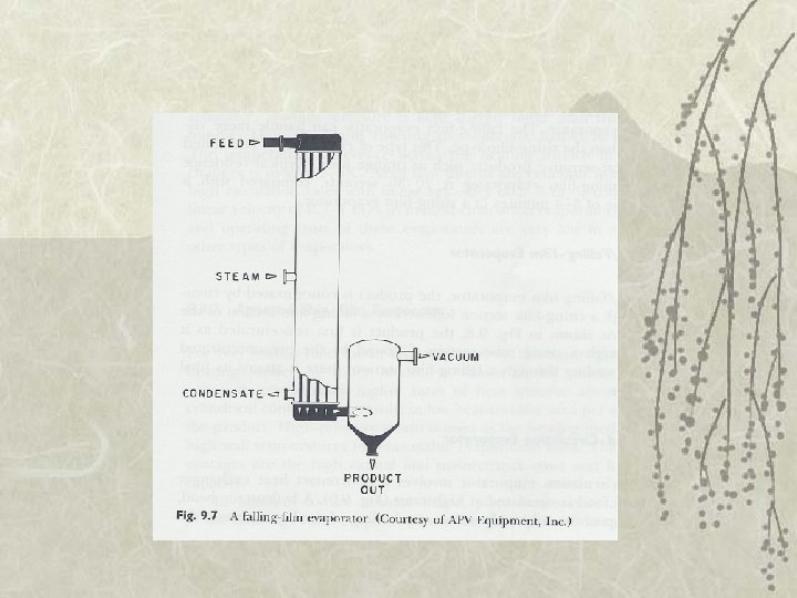 Types of Evaporator v Falling-film evaporator – Thin liquid film move downward – Distribution of liquid in uniform film by spray nozzles – Handle more viscous liquids than risingfilm – Less residence time