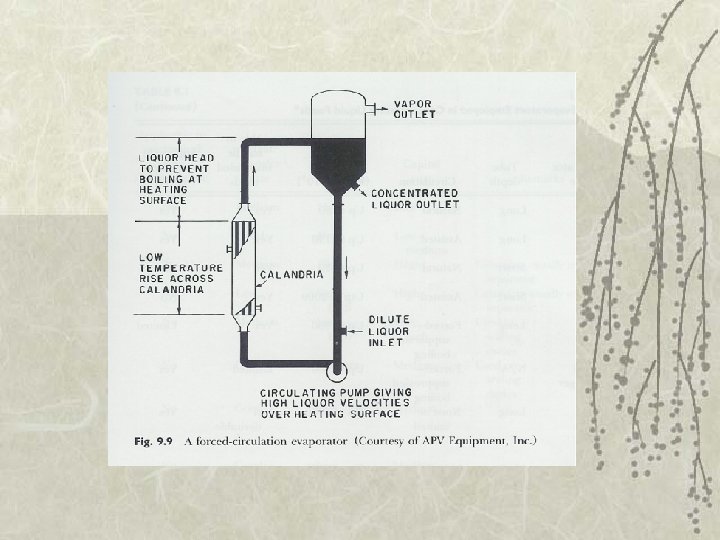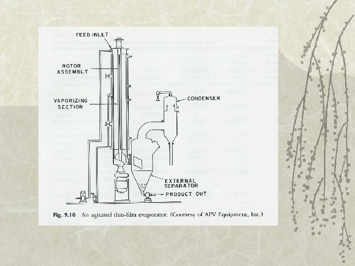 Types of Evaporator v 5. Rising/falling-film evaporator v 6. Forced-circulation evaporator – Use pump to maintain high circulation rates v 7. Agitated thin-film evaporator – Very viscous fluid foods – Feed is spread on heating surface by wiper blades