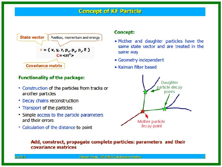 Track fit QA Usually the correctness of track propagation and track fit algorithms is determined using residual and pull distributions. Residual shows the difference between MC and estimated track parameter. Example from CBM STS 7/6/2014 Pull shows the correctness of the error estimation. The variance has to be 1, mean has to be 0. A. Lebedev "Event Reconstruction Algorithms for Modern HEP experiments" 34