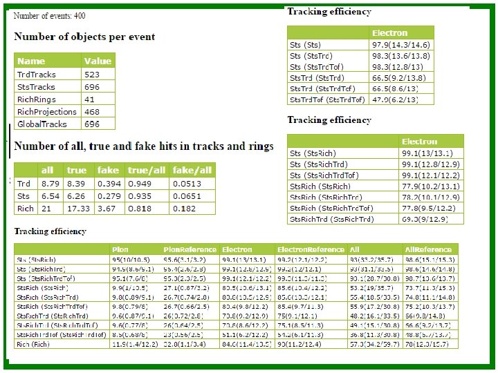 The quality assurance tools The problem of the software quality assurance and testing is of special importance for large complex software systems. In general automatization of regularly performed task is an important component of a well organized software development process. Good and automatized testing procedure can considerably improve the development process, since the developer can be sure that changes made in the code do not crash the program or lead to incorrect simulation results. Currently tracking performance tool allows to calculate: • tracking efficiency in STS, TRD, MUCH, TOF detectors • global tracking efficiency, • ring reconstruction efficiency in RICH detector, • electron identification, • pion suppression performance and other useful quality values.