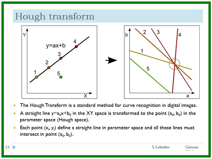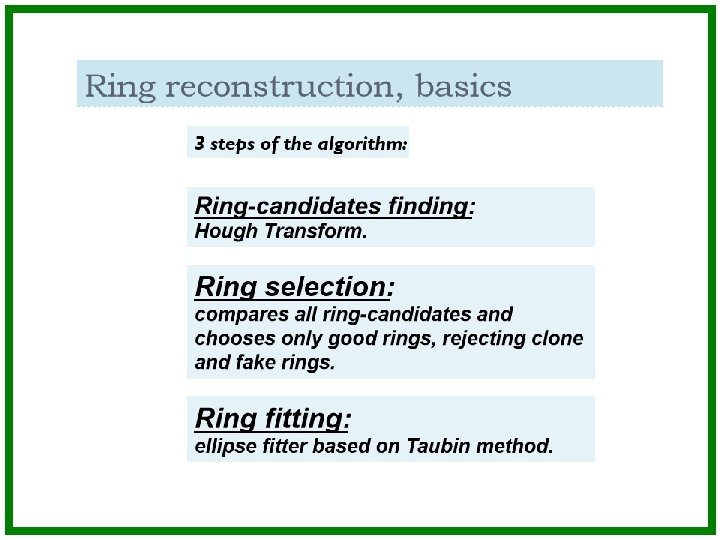 Ring recognition Hough Transform: large combinatorics => slow Localized Hough Transform: much less combinatorics => fast Hough Transform A. Lebedev "Event Reconstruction Algorithms for Modern HEP experiments"