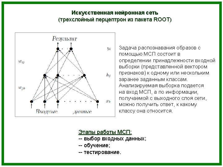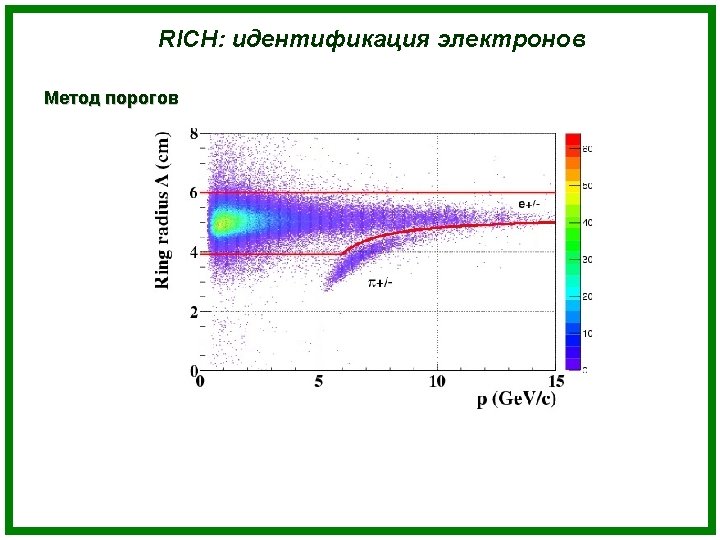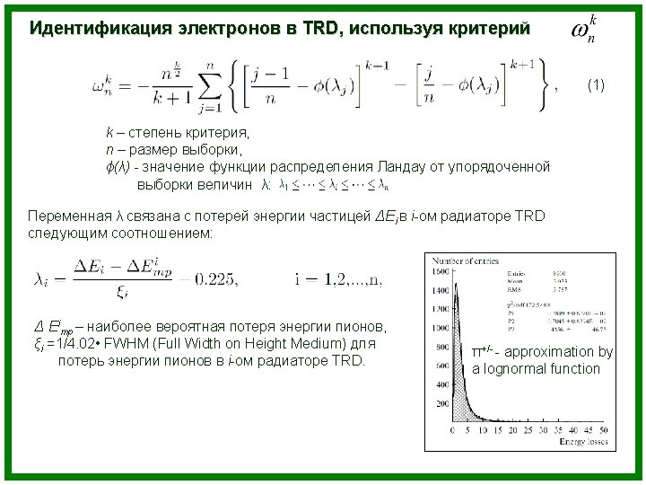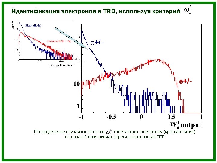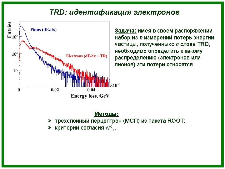 TRD: electron identification Task: looking at the sample of energy losses in n TRD layers, one has to determine which particle (electron or pion) was registered by the detector. Methods: Ø Artificial neural network; Ø Nonparametric goodness of fit criterion wkn ; Ø Likelihood method.