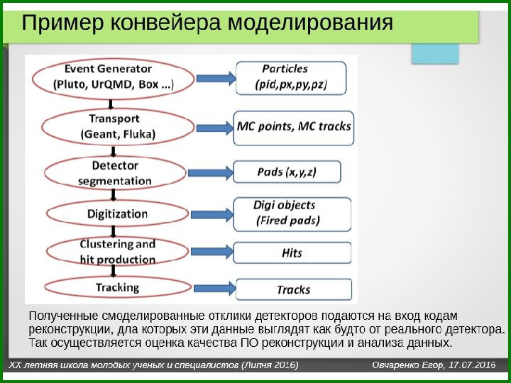 Software in a physical experiment: 1) Simulation 2) Reconstruction - clustering - search oh the hits - recognition and estimation of the track parameters - recognition and estimation of the cherenkov rings - vertex reconstruction - particle identification 3) Analysis - physical analysis - design optimization of the detectors - estimation of the experiment possibilities 4) QA - the quality monitoring of the experimental data - validate of code changes Thank you for your attention