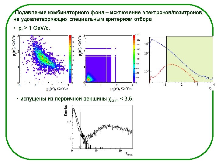 Analysis - physical analysis - design optimization of the detectors - estimation of the experiment possibilities Пример: - trajectory and momentum reconstruction; - electron identification; - additional criteria based on the properties of the desired particles; J/ψ mesons are short lived particles with a lifetime It decays close to the primary vertex - selection of J/ψ-candidates and determination of their characteristics using the KFParticle