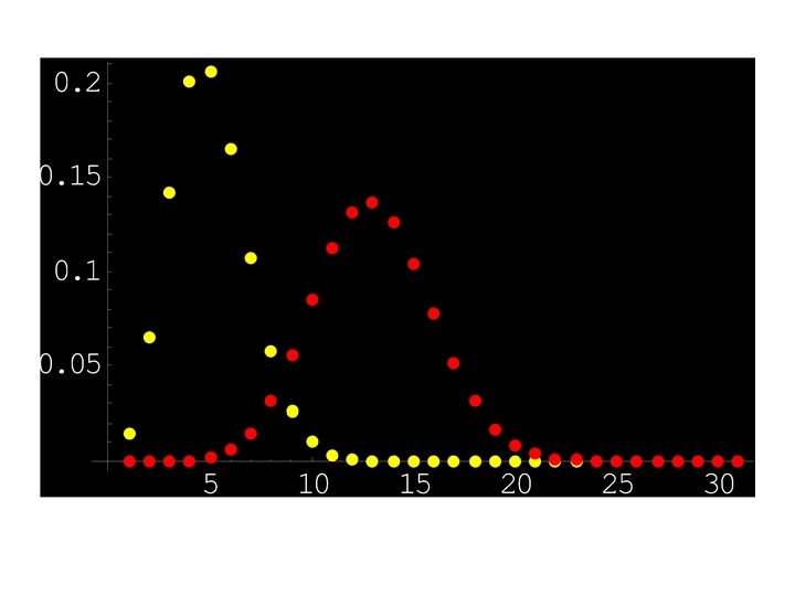 La distribuzione binomiale • All’aumentare della probabilità (da 0. 1 a 0. 3) la distribuzione diviene più simmetrica – Se aumentiamo n (numero delle ripetizioni) nella distribuzione binomiale essa assomiglia sempre più ad una distribuzione gaussiana …