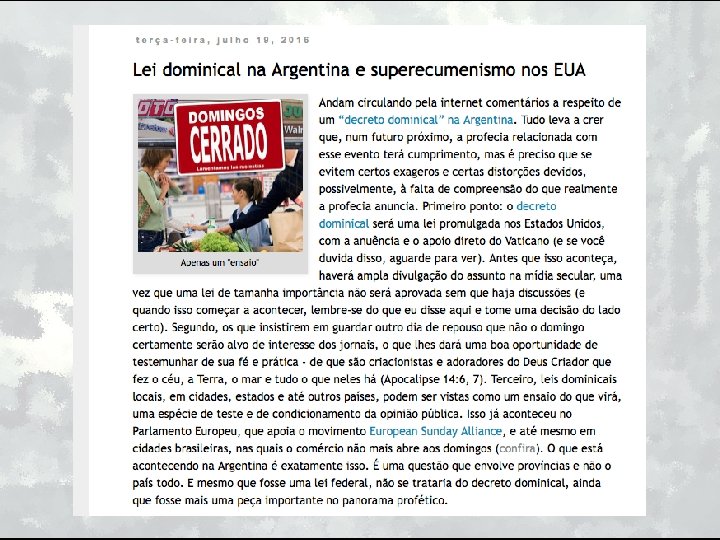DECRETO DOMINICAL “Quando as principais igrejas dos Estados Unidos, ligando-se em pontos de doutrinas que lhes são comuns, influenciarem o Estado para que imponha seus decretos e lhes apóie as instituições, a América protestante terá então formado uma imagem da hierarquia romana, e a inflição de penas civis aos dissidentes será o resultado inevitável. . A imposição da guarda do domingo pelos protestantes é uma obrigatoriedade do culto ao papado. …” Trecho de: Ellen G. White. “Eventos Finais. ” i. Books.