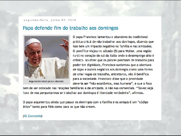 DECRETO DOMINICAL LAUDATO SI • A Natureza o Meio Ambiente precisa de um dia de descanso; • A Sociedade precisa de um dia de descanso; • A Familia precisa de um dia de descanso.