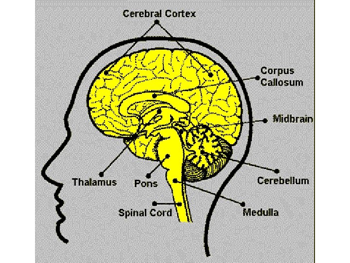 Lets first talk about brain… Parts of Brain: • cerebrum • cerebellum • brain stem (Medulla) • hypothalamus • pituitary gland