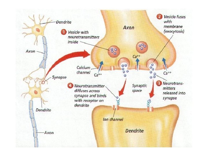 Transmitting to another neuron… • When the Action Potential reaches the terminal, Ca+2 gates open, Ca+2 comes into the cell. • Increase in Ca+2 concentration causes vesicles to fuse with the pre-synaptic membrane and release neurotransmitters into the synapse. • Neurotransmitters bind to receptor proteins on the post-synaptic membrane of the next neuron, which signals Na+ gates to open and the action potential starts all over again.