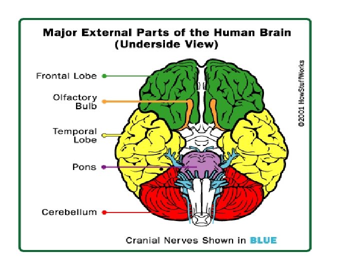 Lets first talk about brain… Parts of Brain: • cerebrum • cerebellum • brain stem (Medulla) • hypothalamus • pituitary gland