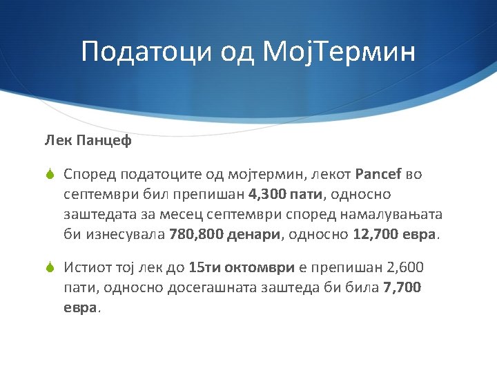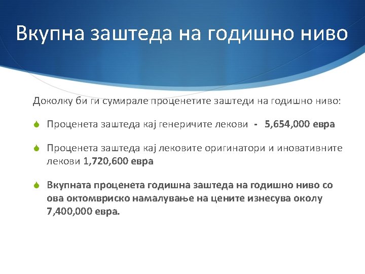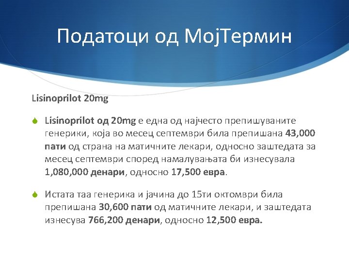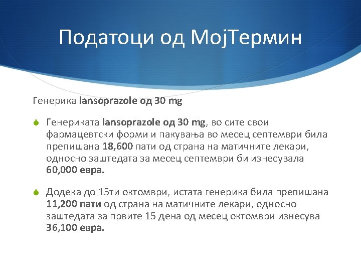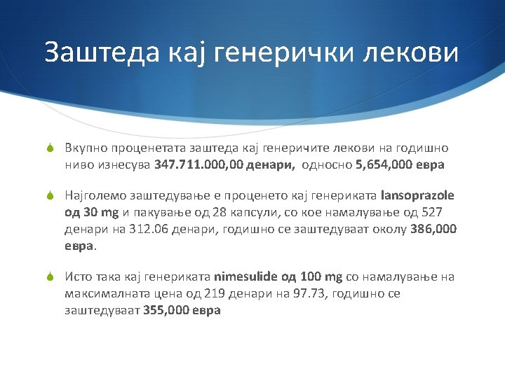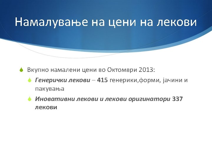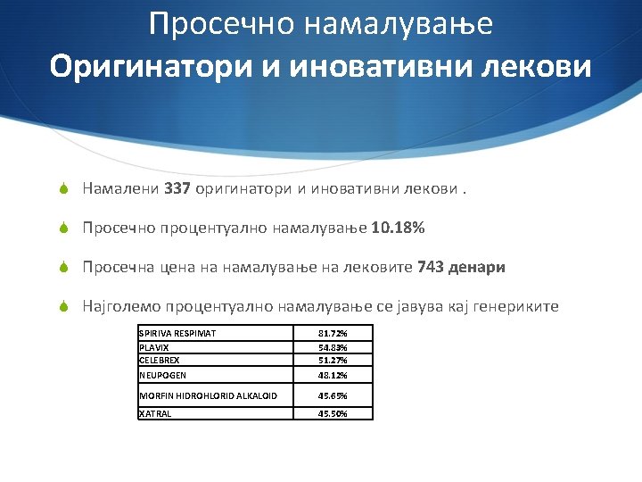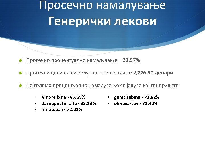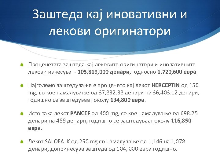 everolimus 10 mg 30 104 340 25 247 Slides: 12 Download presentation Најголемо намалување во денари се јавува кај генериките Јачина Пакување Нова цена Стара цена Разлика % на намалување everolimus 10 mg 30 104, 340. 25 247, 304. 97 142, 964. 72 57. 81% agalsidase beta 35 mg 1 161, 010. 94 230, 518. 60 69, 507. 66 30. 15% zoledronic acid 4 mg/5 ml 10 61, 650. 85 103, 000. 00 41, 349. 15 40. 14% darbepoetin alfa 500 µg/1 ml 1 8, 300. 51 44, 686. 63 36, 386. 12 81. 43% 100 mg 120 76, 774. 59 111, 620. 98 34, 846. 39 31. 22% 140 mg/7 ml 1 21, 757. 62 56, 525. 00 34, 767. 38 61. 51% 250 mg 5 21, 944. 68 53, 167. 36 31, 222. 68 58. 73% 500 mg/25 ml 1 11, 192. 26 40, 000. 00 28, 807. 74 72. 02% Генерика imatinib docetaxel temozolomide irinotecan Најголемо намалување во денари кај иновативни и оригинатори Стара Максимална цена на лек на големо Разлика на стара и нова цена во денари Латинско име Јачина Пакување Максимална цена на лек на големо TARCEVA 150 mg 30 113, 374. 00 128, 655. 76 TARCEVA 100 mg 30 91, 980. 00 105, 046. 70 TYVERB 250 mg 70 66, 221. 56 77, 177. 00 15, 281. 76 13, 066. 70 10, 955. 44 SPIRIVA RESPIMAT 2, 5 mcg/1 инхалација 1 1, 927. 36 10, 545. 53 8, 618. 17 STELARA 45 mg/0, 5 ml 1 176, 266. 10 184, 247. 54 7, 981. 44 IRESSA 250 mg 30 113, 374. 48 121, 133. 40 COPEGUS 200 mg 168 25, 690. 00 33, 046. 67 LITAK 2 mg/1 ml 5 80, 174. 01 86, 863. 35 7, 758. 92 7, 356. 67 6, 689. 34 FLUDARA oral 10 mg 20 23, 853. 51 29, 998. 00 6, 144. 49 MYOZYME 50 mg 1 28, 212. 53 34, 060. 74 5, 848. 21
