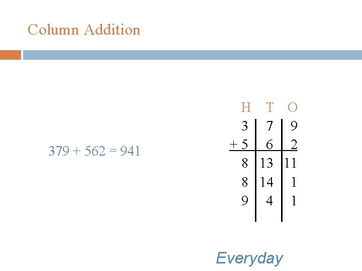 Column Addition 379 + 562 = 941 H T O 3 7 9 +5 6 2 8 13 11 8 14 1 9 4 1 Everyday