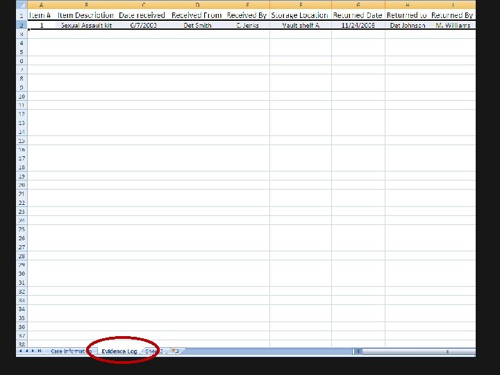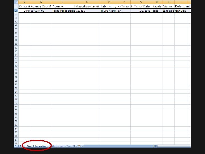 Chain-of-Custody – Documentation of the case information should be maintained including (but not limited to): • • victim’s and defendant’s names offense date of offense county of offense agency case # cause # lab case #