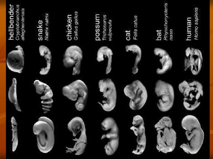 Embryo Similarites n n n The same groups of cells develop in the same order and in similar patterns in all vertebrates. The more alike the embryo stages are, the more closely related the organisms are thought to be. Examples: Turtles, chickens, rabbits, and humans all appear similar as embryos!