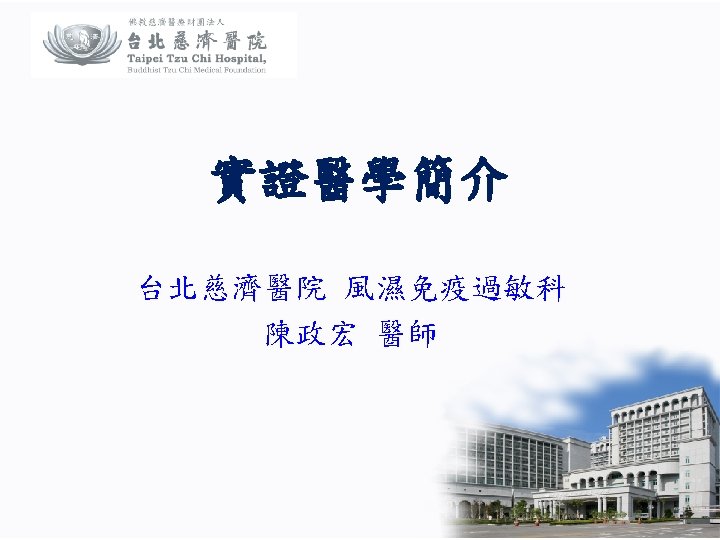Evidence-Based Medicine ※ Use of current best evidence in making decisions about the care of individual patients. ※ EBM is the integration of best research evidence with clinical expertise and patient values. 以流行病學和統計學的方法,從龐大的 醫學資料庫中嚴格評讀、綜合分析並找 出值得信賴的部分,並將所能獲得的最 佳文獻證據,應用於臨床 作中,使病 人得到最佳的照顧。