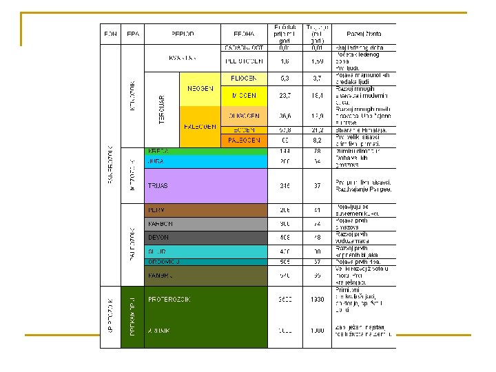 Era kenozoika n Ovo je 5. i posljednja era koja je započela prije oko 65 mil. godina i traje još i sad. Možemo ga zvati i dobom ptica i dobom kukaca. Dijelimo ga na dva perioda: tercijar i kvartar. Tercijar je mnogo stariji i dulji te je trajao 63 milijuna godina i dijeli se na 5 epoha. Ovaj se period još naziva i doba sisavca zbog njihove nagle evolucije. Flora i fauna tercijara slične su današnjima, ali im je raspored zbog različite klime bio znatno drugačiji. Smatra se da je potkraj ovog razdoblja živjelo 80% vrsta današnjeg živog svijeta. Sisavci se, dakle, umnožavaju brojnošću vrsta i dosežu svoj vrhunac, dok će u kvartaru izumrijeti mnoge vrste velikih sisavaca. Kvartar traje već 2 miljuna godina i u njemu smo i danas. Ovaj period dijeli se na starije razdoblje pleistocen koji traje oko 2 milijuna godina te na holocen za koji se uzima da traje oko 11 000 god i u njemu smo i danas.