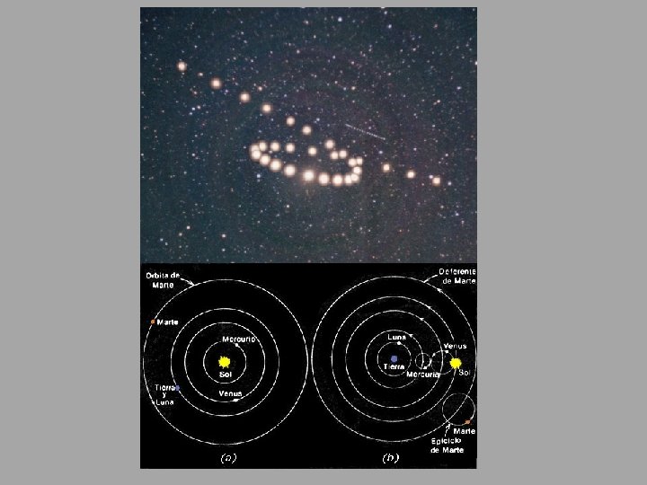 MODELOS COSMOLÓGICOS (a) La imagen del Sistema Solar según Copérnico. El Sol está en el centro y los planetas giran alrededor de él. (b) La imagen del Sistema Solar según Ptolomeo. La Tierra está en el centro y los planetas giran en torno de ella. Ambos investigadores introdujeron estructuras geométricas para explicar el complejo movimiento de los planetas. Por ejemplo, en (b) Marte se mueve en epiciclo (circular)
