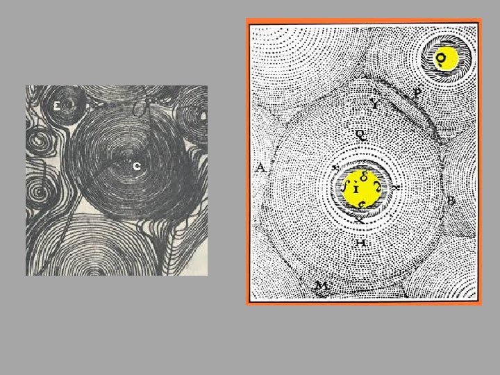 LA TEORÍA DE LOS VÓRTICES Descartes sostiene un modelo astronómico según el cual los elementos del cosmos flotan en un infinito fluido espacial o materia primera, el éter, a la que Dios imprime cierta cantidad de movimiento, siempre constante, haciéndola caer en una serie de vórtices o torbellinos. En el sistema solar, cada planeta gira alrededor del Sol en un vórtice mayor que arrastra a cada uno de ellos en un torbellino local que mueve sus satélites. La teoría confirma datos observables, como la rotación de los planetas en un mismo sentido, y la mayor velocidad de los más cercanos al Sol (asimismo el vórtice de la Tierra permitiría refutar la idea de la pérdida de atmósfera objetada a Copérnico), y el movimiento vortiginoso supone cierta explicación de la gravedad. El inconveniente es la imposibilidad de matematizar este modelo, que no puede comprobarse ni sustituir a la propuesta de Kepler (además hay satélites que giran en sentido contrario).