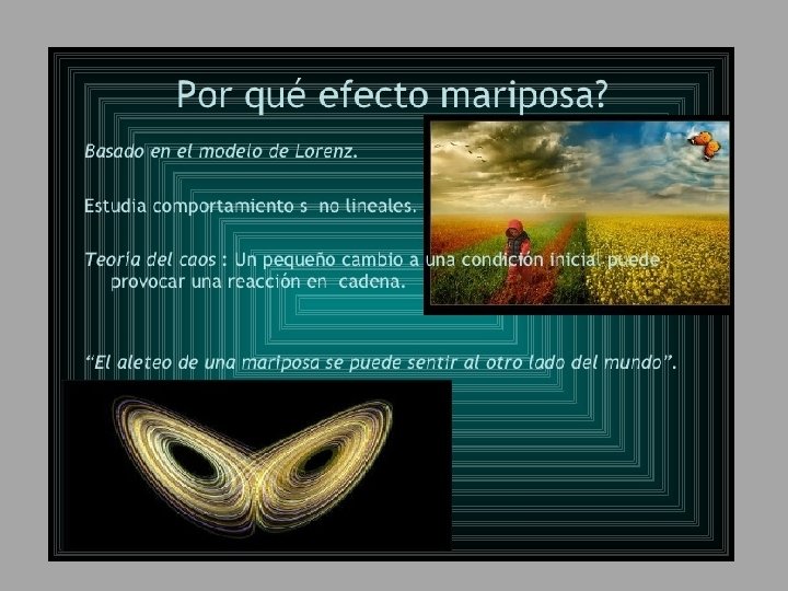 TEORÍA DEL CAOS • Estudia fenómenos cotidianos impredecibles y caóticos, “la porción irregular de la naturaleza, su porción discontinua y variable”. • “Efecto mariposa”: la sensibilidad extrema de las condiciones iniciales de un fenómeno puede hacer que varíe, dando lugar a una situación radicalmente diferente. • La imagen de mecanismo de precisión de la naturaleza no sirve para muchos fenómenos. • La ignorancia parte del propio sistema, no de quien lo estudia.