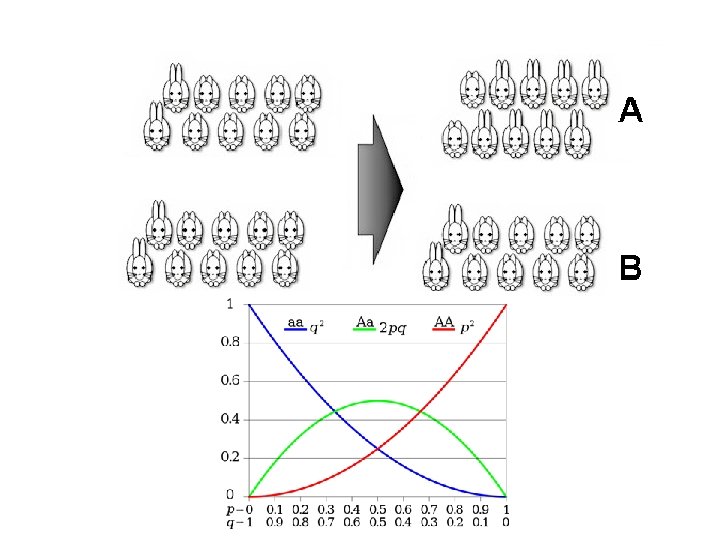 Ley de Hardy-Wienberg • Explica la frecuencia de alelos mediante las siguientes ecuaciones. Ecuación 1: p 1: 2 + 2 pq + q 2 = 1 Ecuación 2: p Ecuación 2: + q = 1 p 2=fracción de población que es homocigótica para el alelo p q 2=fracción de población que es homocigótica para el alelo q 2 pq = fracción de población que es heterocigota p= Frecuencia de un alelo q= Frecuencia de otro alelo