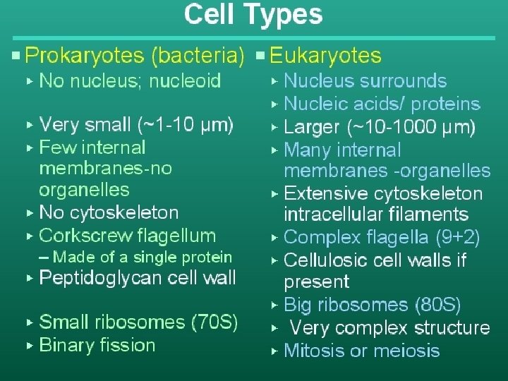 TIPOS DE CELULAS LOS EUCARIOTES; • Son celulas que tienen organelos rodeados de una membrana (celulas eucarioticas). • Son mas grandes que las celulas procarioticas, con un diametro promedio de 20 um. • Las plantas los hongos y los animales son eucarioticos.