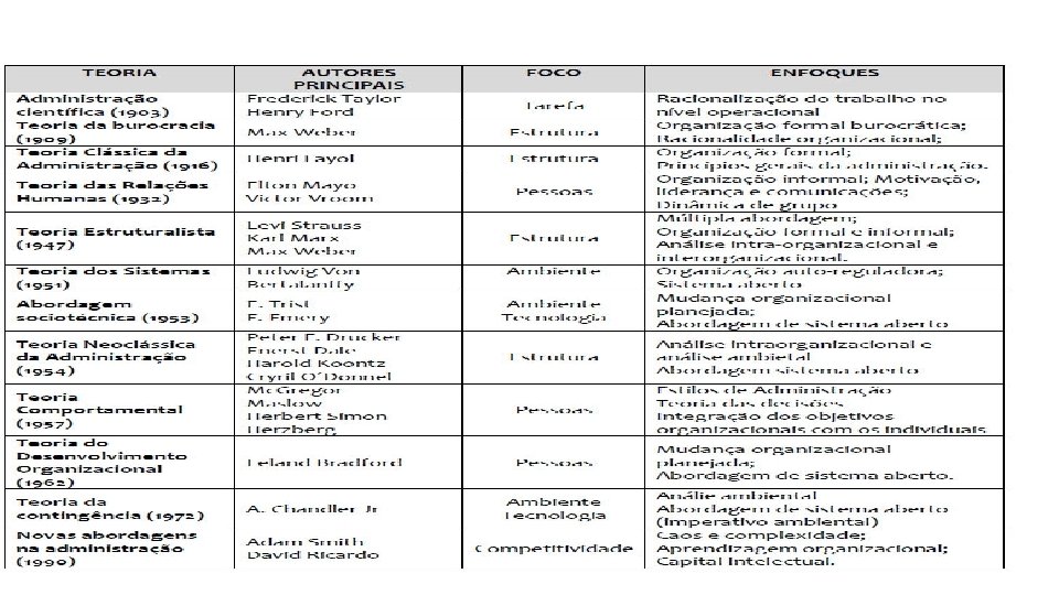 Pessoas: ØTeoria: Teoria das Relações Humanas, Teoria Comportamental. ØEnfoque: Organização informal, motivação, liderança, comunicação e dinâmica de grupo, estilos de administração , integração dos objetivos organizacionais e individuais. Ambiente: ØTeoria: Teoria Estruturalista, Teoria Contingencia. Neo-Estruturalista, Teoria da ØEnfoque: Análise intra-organizacional e análise ambiental, abordagem do sistema aberto , analise ambiental , abordagem do sistema aberto.