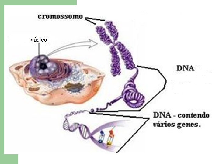 Os cromossomos (23 pares, formando 46 na espécie humana) são formados por DNA. Ao longo da extensão do DNA, estão dispostos milhares de genes (cerca de 30 mil), que contém a instrução genética para a formação de um organismo completo.