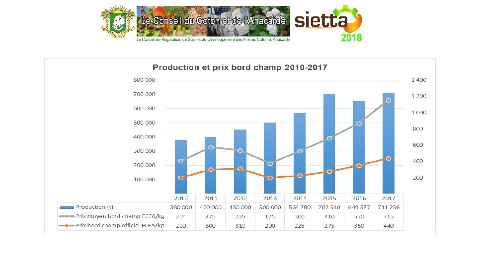 Ø Au niveau de la Commercialisation o Application effective du prix minimum bords champs; o Evolution fulgurante des prix aux producteurs (de 150 F CFA en moyenne à 715 F CFA le kg en 2017); o Suivi rigoureux des transactions commerciales (achats et déchargements dans les magasins intérieurs et portuaires); o Amélioration de la qualité marchande (2 points de KOR, de 46 lbs en moyenne à 48 lbs ); o Maintien de la moyenne du taux d’humidité en dessous de 10% (8, 3% en moyenne)