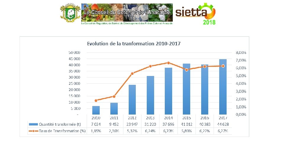 Ø Au niveau de la Transformation o Evolution de la capacité de transformation locale de moins de 45 000 tonnes en 2012 à plus de 100 000 tonnes en 2018 pour 24 Unités de transformation; o Taxation à l’exportation des noix brutes pour financer les industriels locaux (400 F CFA par Kg d’amande, plus de 4 milliards F CFA distribués en 2016 et 2017) ; o Dispositions réglementaires et opérationnelles pour l’approvisionnement des transformateurs locaux (mécanisme de financement, réservation ); o PPCA avec création de zones industrielles dédiées à la transformation de l’anacarde o Organisation du SIETTA en 2014 et en 2016 (3ème édition du 8 au 10 novembre 2018)