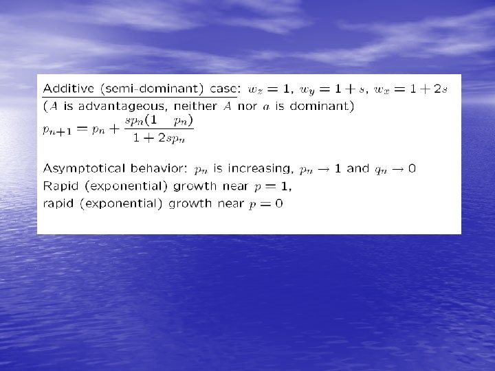 Evolution to advantageous gene: numerical solutions by Matlab (upper): dominant and advantageous, left: s=0. 002, right: s=0. 2 (lower): dominant and recessive, left: s=0. 002, right: s=0. 2