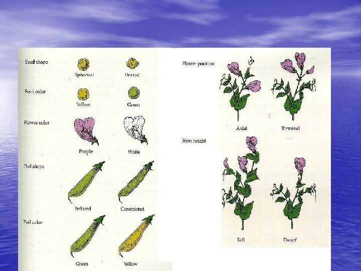 Examples of Mendel traits Difference in the form of the ripe seeds Round (R) and wrinkled (r) cotyledons Difference in the color of the seed coat Colored (A) and white (a) flowers Difference in the color of the seed albumen Yellow (I) and green (i) cotyledons Difference in the color of the unripe pods Green (Gp) or yellow (gp) pod wall