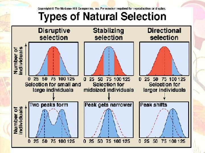 • Natural selection acts on variations. Some variations among species increase or decrease an organism’s survival rate. There are three types of selection that act this way: stabilizing selection, directional selection and disruptive selection.