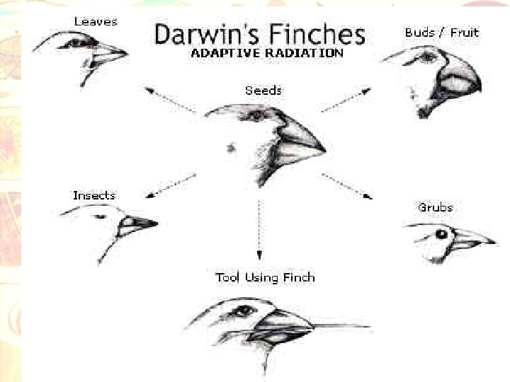 • One adaptation that he observed was the differences among finches. The Galapagos finches resembled the finches on the mainland, but differed in nesting site, beak shape and eating habits. Each finch seemed to acquire a beak shape that catered to its specific eating habits.