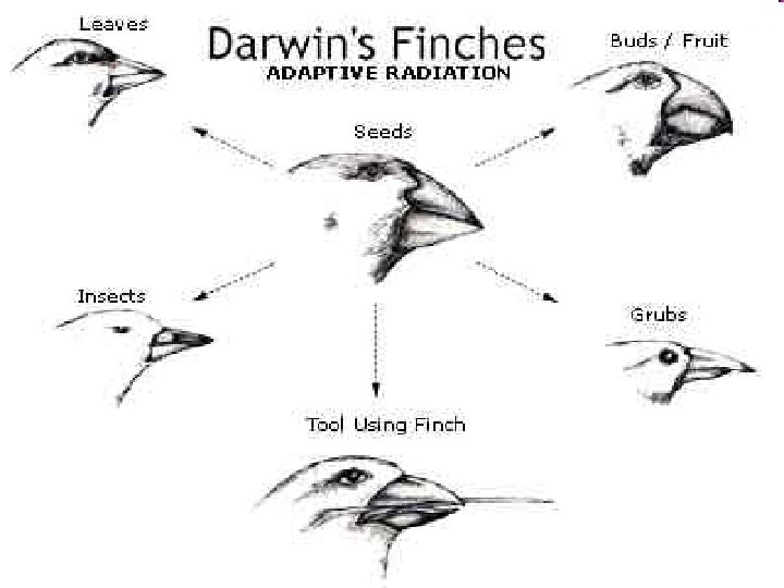 Speciation l l Changes in closely related organisms that result in enough of a difference to be classified as a separate species. This happens when populations of one species are geographically isolated and each must adapt to its new environment. Speciation that occurs in this way is called ADAPTIVE RADIATION. In the case of the finches, their beaks developed differently depending upon the food sources available in their specific geographic location.