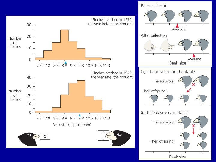 Medium Ground Finches 1. The birds vary in multiple phenotypic traits (wing length, beak size, tail length, etc. ) 2. Is this variation heritable (vs. nurture/environment)? Examined parents and offspring, beaks sizes are heritable/+ genetic studies showing this as well 3. Drought showed that there are differences in survival among the finches, population size declined 4. Those that survived had larger beaks (eat big seeds)
